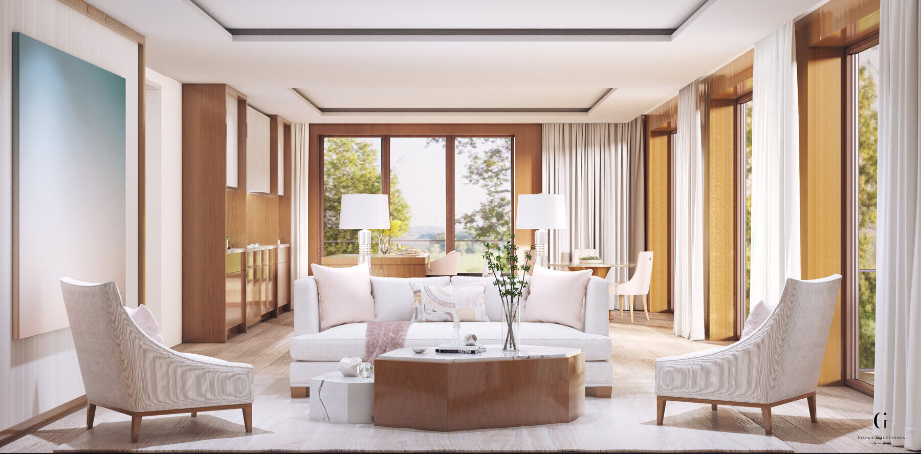 Projekt wnętrza tego domu stanowił dla mnie wyjątkową przyjemność. Inwestorom zależało napodkreśleniu widoku zza okien pełnego zieleni oraz na zastosowaniu naturalnego drewna iciepłej tonacji. Resztę kwestiioddali w moje ręce, zdając się na moje wyczucie i gust. W tejkategorii projekty domów charakteryzują się innowacyjnymi rozwiązaniami, takimi jak dużeprzeszklenia, otwarte przestrzenie oraz przestronne wyjścia na taras czy balkon. Tego rodzajuarchitektura sprawia, że salon płynnie przechodzi w ogród, co dodaje rezydencji poczucia luksusu.